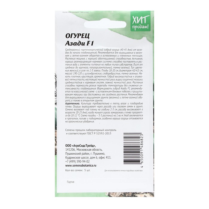 Среднеранний партенокарпический гобрид огурца (40-45 дней от вско- дов до начало плодоношения). Рекомендуется для выращивания в весеннем и летне-осеннем оборотах в остекленных и пленочных теплицах. Растения мощные, с хорошей адаптацианной способностью, Активная, хорошо регенерирующая корневая система способма постовлять в растения водуи элементы питания на любых типах субстратов Лист ат среднего до крупного, полугоризонтальный, темно-зеленый. Тип цветения женский в узле по 2-3 завязи. Плоды 18-20 см, диометром 4.0-45 см. массой 190-220 г. цилиндрические, слаборебристые, темно-зеленые. Мякоть плотная, хрустящая, аромотная, Гибрид высокоустойчив к оливковой пятнистости, настоящей мучнистой росе, вирусу огуречной мозаики среднеустойчив к корневым гнильм, ложной мучнистой росе. Ростения способны переносить резкие перепады температуры без снижения интенсивности плодоношения, Формировать гибрид Азоди F1 рекомендуется по классической схеме - состовлением боковых побегов и прыщи ванием макушки при достижении ею соседнего ростения, Рекомендован для выращивания в защищенном грунте (весенний и летне-осенний оборот), а токже в открытом грумте.