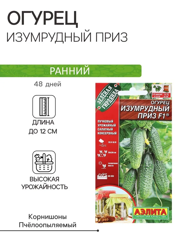 Вкусовые качества отличные. Урожайность – 9 кг/м2. Плоды транспортабельные, выравненные по размеру в течение всего периода выращивания. Плоды рекомендуется собирать в стадии пикуль, корнишон, зеленец. Гибрид обладает комплексной устойчивостью к заболеваниям. Универсального назначения, прекрасно подходит для консервирования. Рекомендован для выращивания в защищенном грунте (весенний и летне-осенний оборот), а также в открытом грунте.