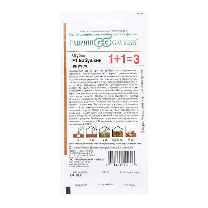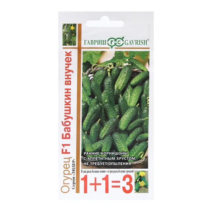 Скороспелый (38-43 дней от всходов до плодоношения) урожайный партенокарпический гибрид преимущественно женского типа цветения для выращивания в открытом грунте и под пленочными укрытиями. Растение мощное, с ограниченным ростом боковых побегов и букетным заложением завязей, до 2-4 шт. в узле. Корнишоны короткие, цилиндрической формы, массой 110-120 г, темно-зеленые, среднебугорчатые, бугорки расположены средне, с белым опушением. Плоды прекрасного вкуса, плотные, хрустящие, с освежающим ароматом. Идеальны для свежих салатов, засолки и консервирования. Гибрид устойчив к кладоспориозу, мучнистой росе и корневым гнилям. Урожайность 12,8 кг/м?. Посев на рассаду производят в конце апреля – начале мая. Высадку в грунт — в конце мая - начале июня в фазе двух-трех настоящих листьев под временные пленочные укрытия. Посев в открытый грунт производится в конце мая - в начале июня. Схема посадки: 50х50 см. Оптимальная для прорастания семян температура почвы 25-30°C.