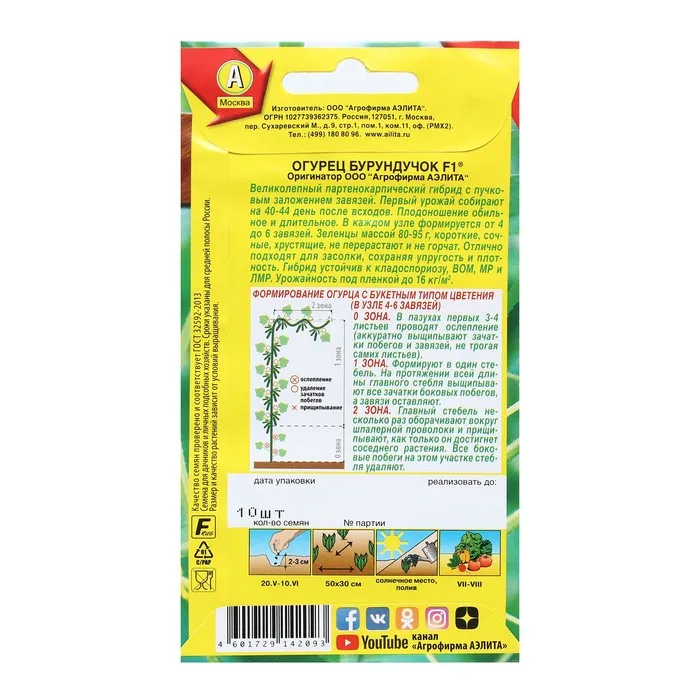 Великолепный партенокарпический гибрид с пучковым заложением завязей. Первый урожай собирают на 40-44 день после всходов. Плодоношение обильное и длительное. В каждом узле формируется от 4 до 6 завязей. Зеленцы короткие, сочные, хрустящие, не перерастают и не горчат. Отлично подходят для засолки, сохраняя упругость и плотность. Гибрид устойчив к большинству заболеваний. Агротехника. Посев семян в грунт или на рассаду. Возраст рассады при высадке – 20-30 дней. Плотность посадки в теплицах 2-3 растения на 1 м2. Растения подвязывают к шпалере и формируют в один стебель. Боковые побеги прищипывают над вторым-третьим листом. Растениям необходимы регулярные поливы, прополки, рыхления и подкормки. Сбор плодов нужно проводить регулярно каждые 2-3 дня.