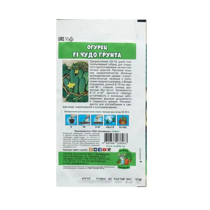 Среднеспелый, 50-55 дней, пчелоопыляемый гибрид для открытого грунта и весенне-летних пленочных укрытий. Растение мощное, среднеплетистое. Зеленцы цилиндрические, средне - и крупнобугорчатые, зеленые с полосками среднего размера, с белым опушением, длиной 8-10 см, массой 90 г, сладкие, сочные, ароматные, без пустот. Урожайность 8-10 кг/м.
