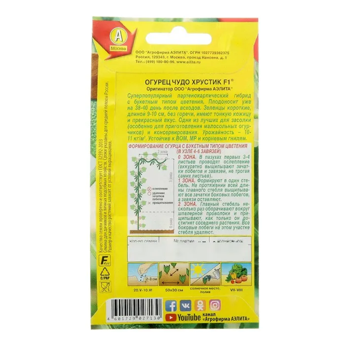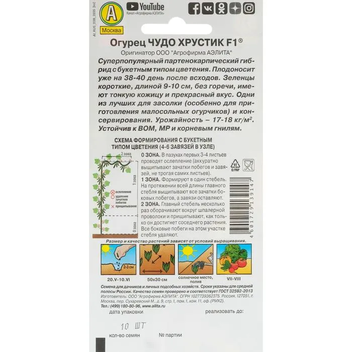 «Чудо хрустик» — это раннеспелый партенокарпический сорт для открытого грунта. Плодоношение начинается на 38–40-й день от всходов.