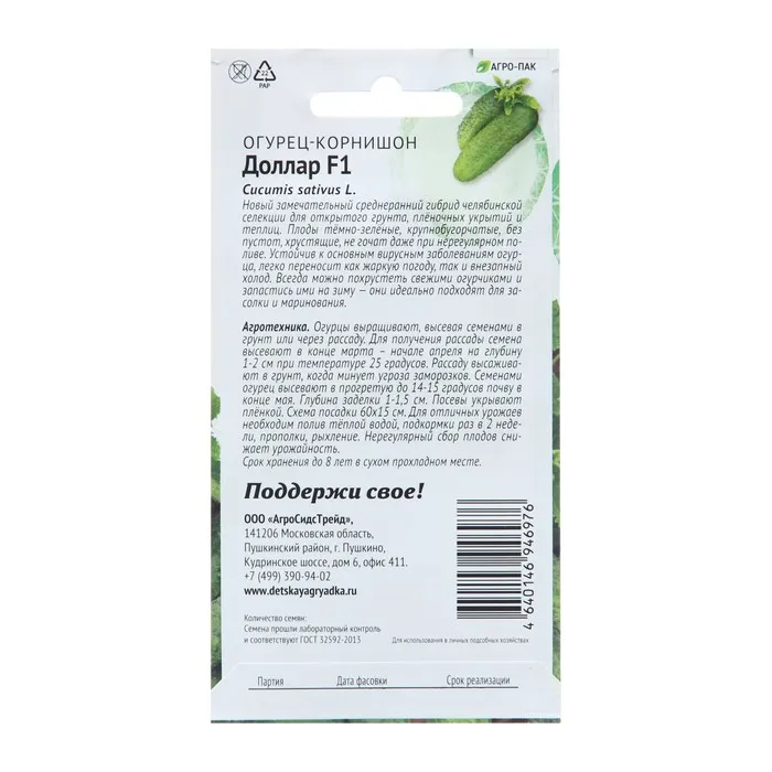 Семена Огурец "Доллар F1" корнишон, 10 шт — Характеристики
