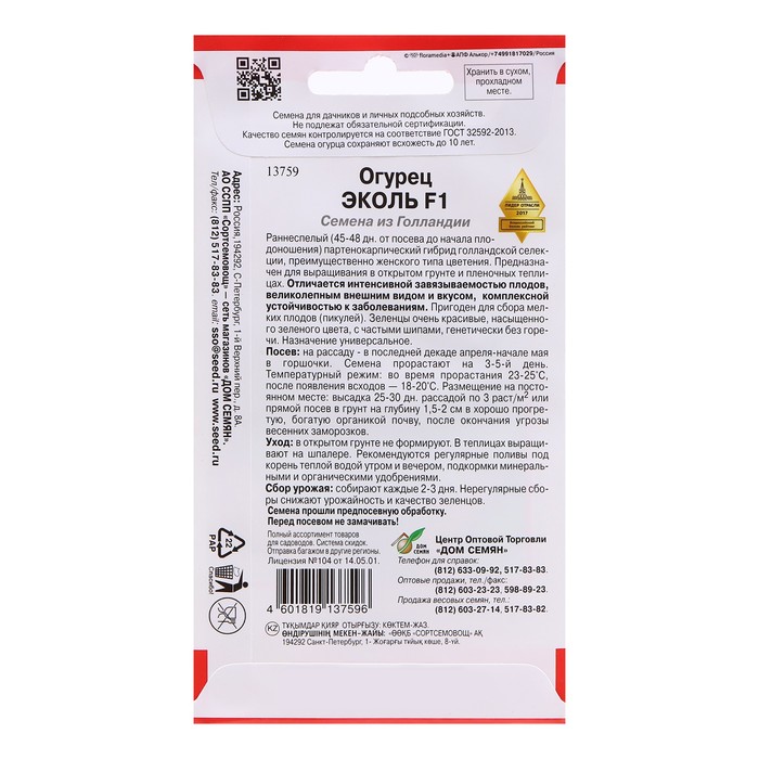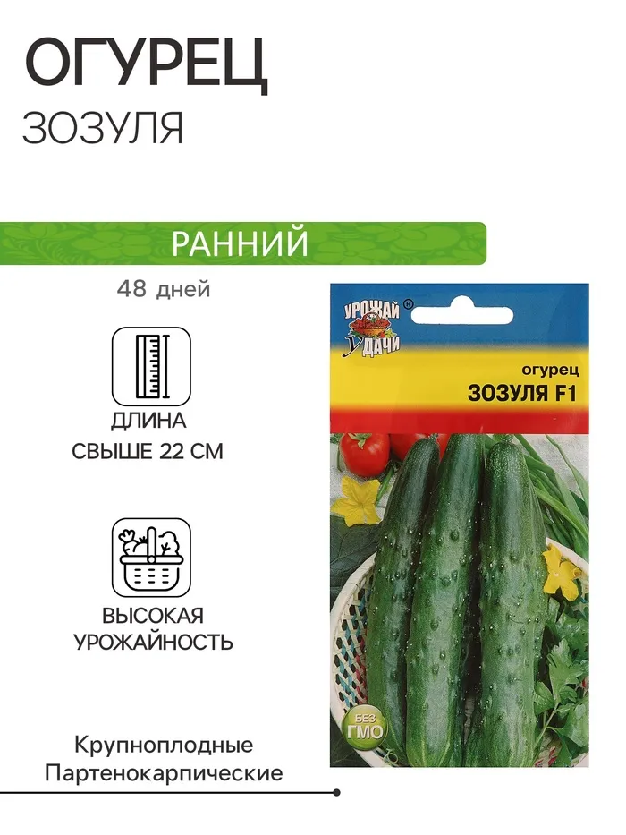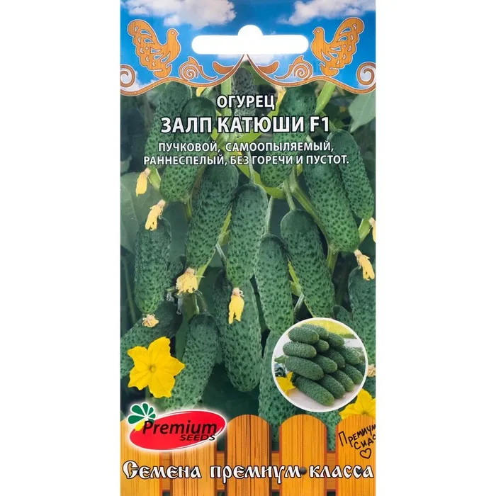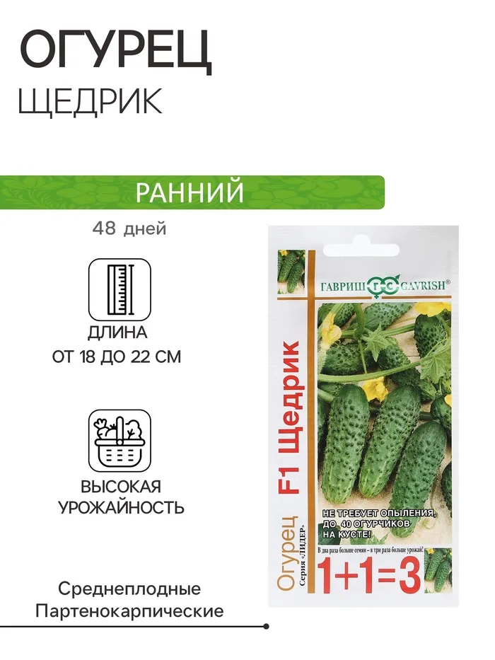 Среднеранний (43-45 дней от всходов до плодоношения) партенокарпический (не требует опыления) гибрид с интенсивной завязываемостью плодов. Рекомендуется для выращивания в теплицах, пленочных укрытиях и в открытом грунте. Растение мощное, с короткими междоузлиями. Зеленец короткий, цилиндрический, насыщенного зеленого цвета, среднебугорчатый, без горечи, с маленькой семенной камерой. Идеально подходит для сбора пикулей (плоды длиной 4-5 см), засолки и маринования. Гибрид устойчив к кладоспориозу и мучнистой росе, относительно устойчив к вирусу огуречной мозаики.