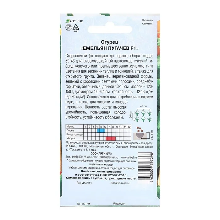 Скороспелый (от всходов до первого сбора пло¬дов 39-43 дня) высокоурожайный партенокарпический гибрид женского или преимущественно женского типа цветения для весенних теплиц и тоннелей, а также для открытого грунта. Зеленец веретеновидной формы, зеленый с короткими светлыми полосами, среднебугорчатый, белошипый, длиной 13-15 см, массой - 120- 150 г, диаметром 4,0-4,4 см. Урожайность - 12- 16 кг/м2 (до 30 кг/м2). Используется для потребления в свежем виде, а также для засолки и консервирования. Ценность сорта 45 см: высокая урожайность, повышенная холодостойкость, устойчивость к болезням.