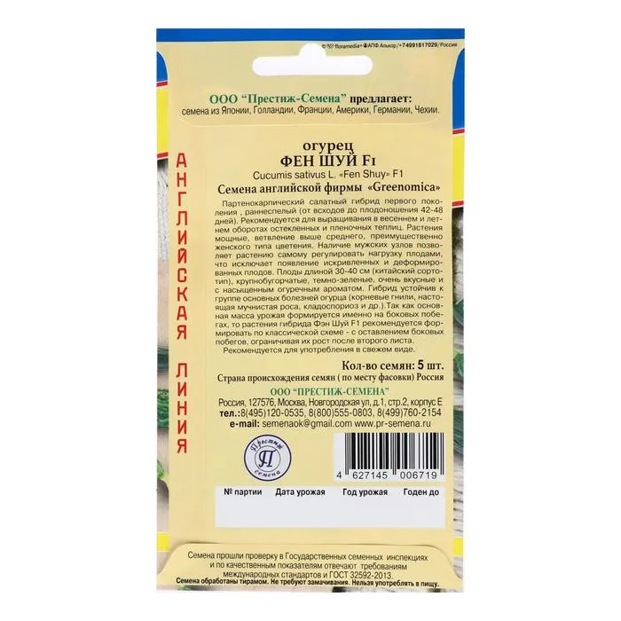 Семена Огурец "Фен Шуй" F1, 5 шт — Характеристики