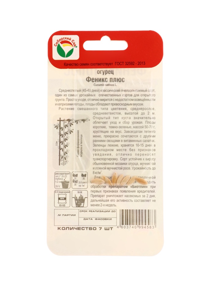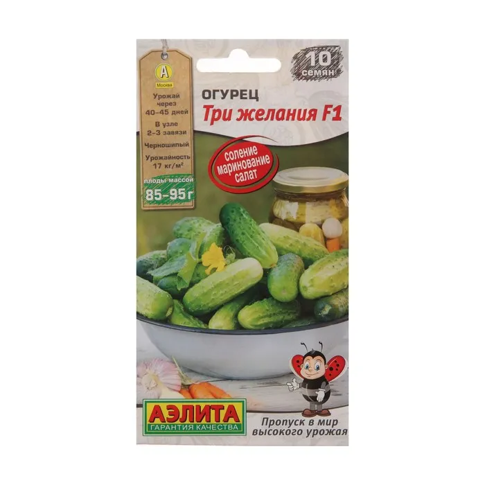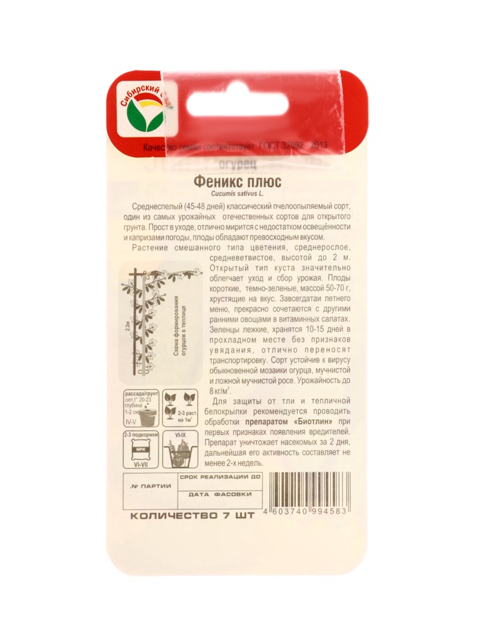 Растение смешанного типа цветения, среднерослое, средневетвистое, высотой до 2м. Открытый тип куста значительно облегчает уход и сбор урожая. Плоды короткие, темно-зеленые, массой 50- 70г, хрустящие на вкус. Завсегдатаи летнего меню, прекрасно сочетаются с другими ранними овощами в витаминных салатах. Зеленцы лежкие, хранятся 10-15 дней в прохладном месте без признаков увядания, отлично переносят транспортировку. Сорт устойчив к вирусу обыкновенной мозаики огурца, мучнистой и ложной мучнистой росе. Урожайность до 8кг/м2.