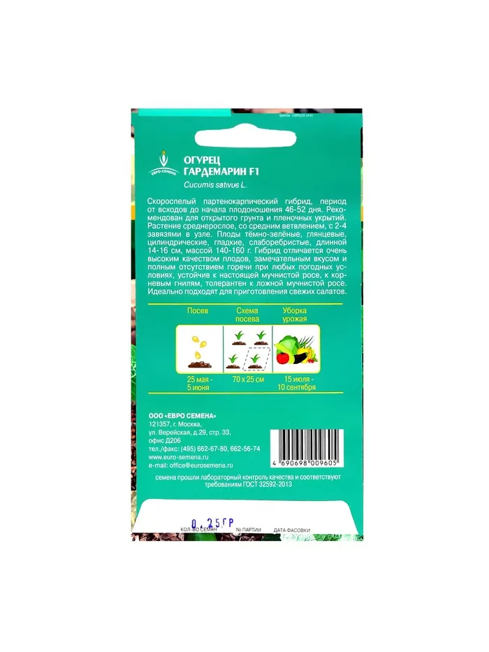 Скороспелый партенокарпический гибрид, период от всходов до начала плодоношения 46-52 дня. Рекомендован для открытого грунта и пленочных укрытий. Растение среднерослое, со средним ветвлением, с 2-4 завязями в узле. Плоды тёмно-зелёные, глянцевые, цилиндрические, гладкие, слаборебристые, длинной 14-16 см, массой 140-160 г. Гибрид отличается очень высоким качеством плодов, замечательным вкусом и полным отсутствием горечи при любых погодных условиях, устойчив к настоящей мучнистой росе, к корневым гнилям, толерантен к ложной мучнистой росе. Идеально подходят для приготовления свежих салатов.