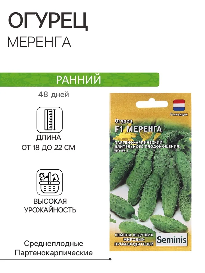 Очень ранний (40-42 дн. от всходов), высокоурожайный партенокарпический гибрид женского типа цветения. Предназначен для выращивания в открытом грунте и пленочных теплицах. Зеленцы мелкобугорчатые, среднеопушенные, однородные (8-10 см), красивые, хрустящие, генетически без горечи. В каждом узле формируется до 6 завязей. Гибрид отличается стабильным плодоношением в различных климатических условиях, устойчивостью к перепадам температур и комплексу заболеваний, великолепным качеством плодов. Идеален для переработки.Назначение универсальное.Посев: на рассаду - в последней декаде апреля- начале мая в горшочки. Температурный режим : во время прорастания 23-25°С, после появления всходов -18 -20°С. Размещение на постоянном месте: высадка 25-30 дн. рассадой по 3 раст/м2 или прямой посев в грунт на глубину 1,5-2 см в хорошо прогретую, богатую органикой почву, после окончания угрозы весенних заморозков. Перед посевом не замачивать!Уход: в открытом грунте не формируют. В теплицах выращивают на шпалере. Для получения более ранней продукции побеги в нижних 5 междоузлиях прищипывают на один плод и лист. Затем прищипывают боковые побеги до высоты 1-1,2 м. Далее растение не формируют. Рекомендуются обильные регулярные поливы отстоявшейся водой ежедневно, подкормки минеральными и органическими удобрениями.Сбор урожая: собирают через день в открытом грунте и ежедневно в теплицах. Нерегулярные сборы снижают урожайность и качество зеленцов.