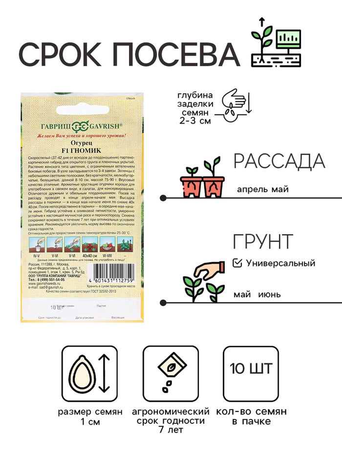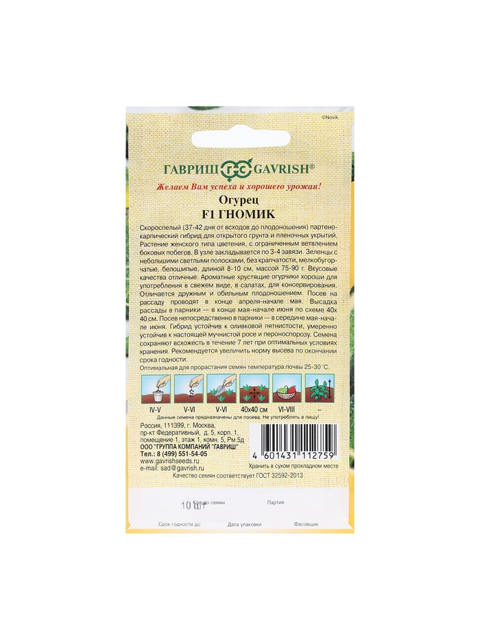 Скороспелый (37-42 дней от всходов до плодоношения) партенокарпический гибрид для открытого грунта и пленочных укрытий. Растение женского типа цветения, с ограниченным ветвлением боковых побегов. В узле закладывается по 3-4 завязи. Зеленцы с небольшими светлыми полосками, без крапчатости, мелкобугорчатые, белошипые. Длиной 8-10 см, массой 75-90 г. Вкусовые качества отличные. Ароматные, хрустящие огурчики хороши для употребления в свежем виде, в салатах, для консервирования. Отличается дружным и обильным плодоношением. Посев на рассаду производят в конце апреля - начале мая. Высадка рассады в парники — в конце мая-начале июня, по схеме 40х40 см. Посев непосредственно в парники — в середине мая-начале июня. Гибрид устойчив к оливковой пятнистости, умеренно устойчив к настоящей мучнистой росе и пероноспорозу. Семена после уборки сохраняют всхожесть в течение 7 лет при оптимальных условиях хранения. Рекомендуется увеличить норму высева по окончанию срока годности.