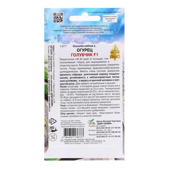 Скороспелый (42-45 дней от посева до плодоношения) пчелоопыляемый гибрид, предназначен для выращивания в открытом грунте и под временными пленочными укрытиями. Растение сильнорослое, длина главного стебля - 140-190 см. Зеленец овально-цилиндрический, зеленый с размытыми светлыми полосами до 1/3 длины, крупнобугорчатый с редким расположением бугорков. Опушение сложное, черное. Длина плода 9-12 см, масса 80-95 г. Мякоть хрустящая, без горечи. Характеризуется комплексной устойчивостью к болезням. Посев на рассаду в начале мая. Высадка в грунт в конце мая - начале июня в фазе двух-трех настоящих листьев. Посев в открытый грунт проводится в конце мая - начале июня. Схема посадки 40х40 см.