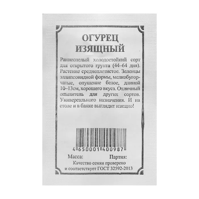 Плоды высоких вкусовых качеств. Для открытого грунта. Раннеспелый пчёлоопыляемый сорт. Период от всходов до начала плодоношения 44-50 дней. Растение среднеплетистое, боковых побегов 5-6. Плоды эллипсовидной формы, мелкобугорчатые, опушение белое. Масса 65-140 г, длина 10-13 см. Отличаются высокой однородностью и товарностью, не желтеют. Сорт универсального использования. Обладает повышенной устойчивостью к понижению температуры. Хороший опылитель.