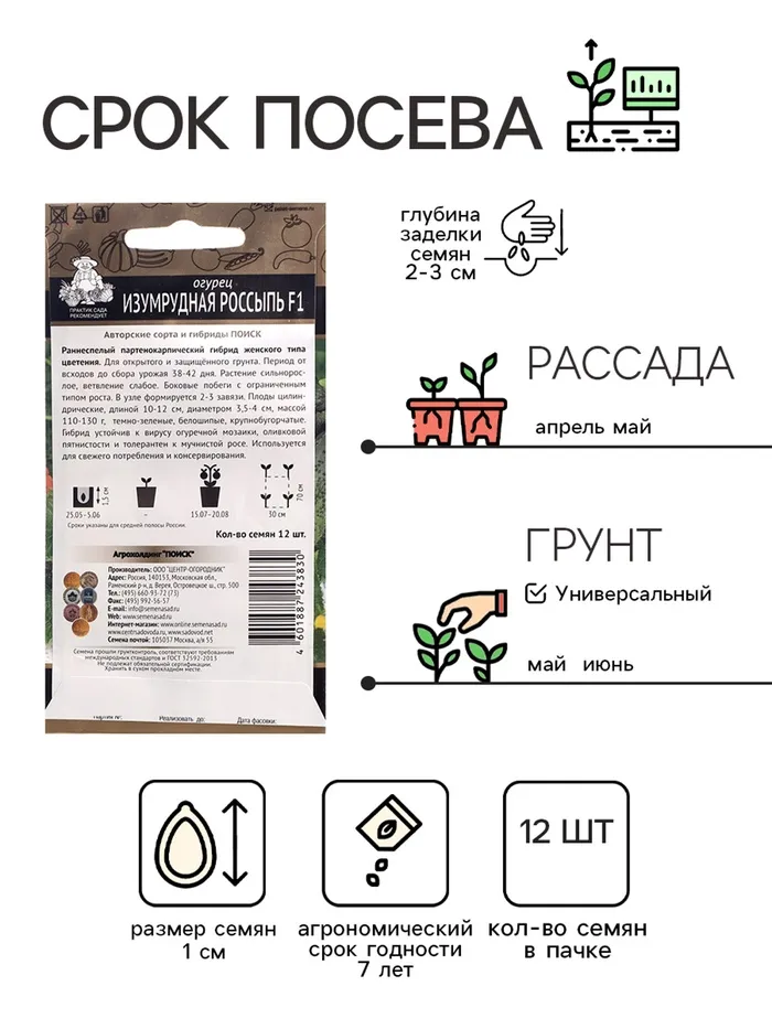 Раннеспелый партенокарпический гибрид женского типа цветения. Для открытого и защищённого грунта. Период от всходов до сбора урожая 38-42 дня. Растение сильнорослое, ветвление слабое. Боковые побеги с ограниченным типом роста. В узле формируется 2-3 завязи. Плоды цилиндрические, длиной 10-12 см, диаметром 3,5-4 см, массой 110-130 г, темно-зеленые, белошипые, крупнобугорчатые. Гибрид устойчив к вирусу огуречной мозаики, оливковой пятнистости и толерантен к мучнистой росе. Используется для свежего потребления и консервирования.