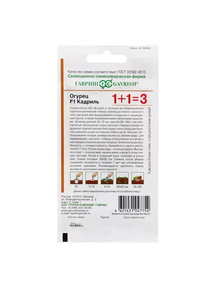 Скороспелый (43-48 дней от всходов до плодоношения) партенокарпический гибрид преимущественно женского типа цветения для выращивания в открытом и защищенном грунте, а также под временными пленочными укрытиями. Зеленец длиной 10-12 см, массой 90-100 г, частобугорчатый, белошипый, очень прочный. Гибрид отличается дружной отдачей урожая благодаря очень большим букетам завязей в узлах на главном побеге (до 8-10 штук). Использование плодов универсальное (в свежем виде, для маринования, засолки). Гибрид относительно устойчив к настоящей и ложной мучнистой росе. Отличительная особенность – холодостойкость. Урожайность одного растения 6,0-7,0 кг.