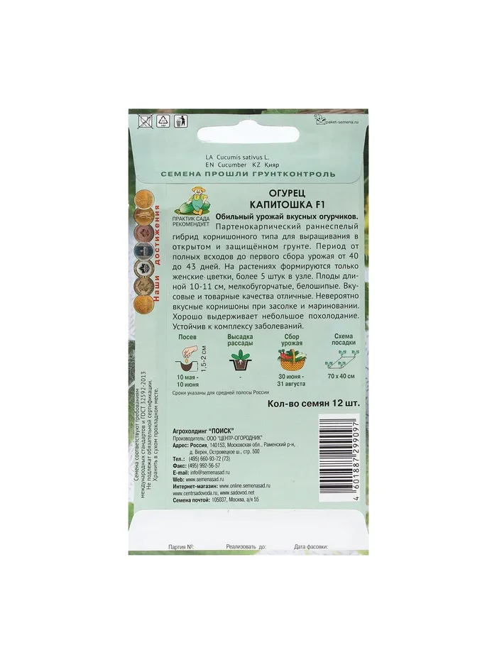 Обильный урожай вкусных огурчиков. Партенокарпический раннеспелый гибрид корнишонного типа для выращивания в пленочных теплицах и открытом грунте. Период от полных всходов до первого сбора урожая от 40 до 43 дней. На растениях формируются только женские цветки, более 5 штук в узле. Плоды длиной 10-11 см, мелкобугорчатые, белошипые. Вкусовые и товарные качества отличные. Невероятно вкусные корнишоны при засолке и мариновании. Хорошо выдерживает небольшое похолодание. Устойчив к комплексу заболеваний.