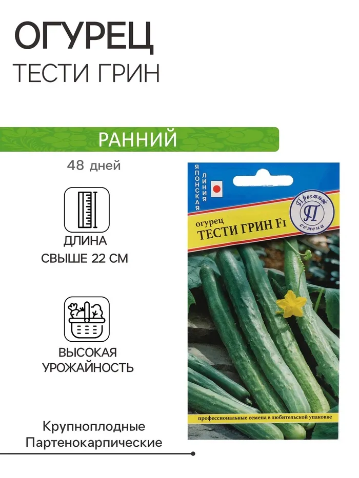 Раннеспелый сорт женского типа цветения, с дружной отдачей урожая, для открытого и защищенного грунта. Плоды плотные, хрустящие, очень вкусные, без горечи, мелкобугорчатые, выровненные, веретеновидной или удлиненно-эллипсовидной формы длиной 13-15 см., массой 90-120г. Отлично подходят для засолки, консервирования и потребления в свежем виде. Сорт устойчив к ложной мучнистой росе.
