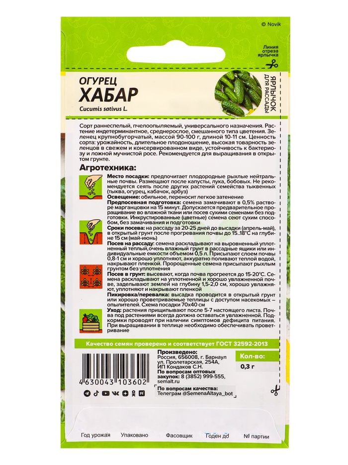Семена Огурец «Хабар», 0.3 г, «Семена Алтая» — Характеристики