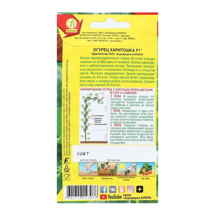 Новый раннеспелый гибрид-партенокарпик, вступает в плодоношение на 45 день от всходов. Показывает прекрасные результаты в пленочных теплицах и в открытом грунте, хорошо адаптируется к неблагоприятным погодным условиям. Растения индетерминантные, среднерослые, слабоветвистые, преимущественно женского типа цветения. Завязи закладывают пучками, от 2-3 до 4-5 шт в узле, в зависимости от условий освещения и питания. Плоды цилиндрические, крупнобугорчатые, белошипые, массой 80-85 г, с превосходным вкусом. Пригодны для консервирования. Урожайность под пленкой 12-15 кг/м². Агротехника. Посев семян в грунт или на рассаду. Возраст рассады при высадке – 20-30 дней. Плотность посадки в открытом грунте 4-5 растений, в теплицах 2-3 растения на 1 м². В теплицах растения подвязывают к шпалере и формируют в один стебель. Боковые побеги прищипывают над 2-3 листом.