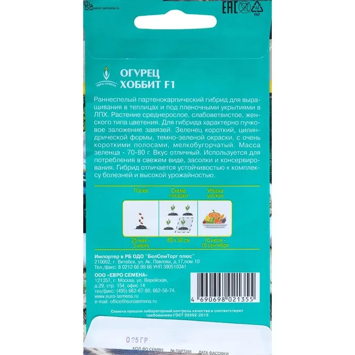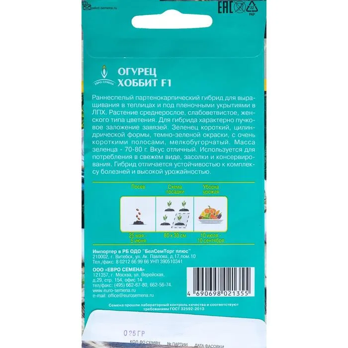 Семена Огурец "Хоббит" раннеспелый, партенокарпический, цв/п, 0,25 г — Характеристики