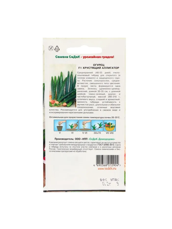 Среднеранний (48-55 дней) пчелоопыляемый гибрид для открытого (в теплом климате) и защищенного грунта. Растение сильнорослое, средневетвистое, смешанного типа цветения. В пазухе листа формируется одна завязь. Зеленец удлиненно-цилиндрический, длиной 30-35 см, с длинной шейкой, темно-зеленый, крупно и часто бугорчатый, массой 280-310 г, отличного вкуса, сладкий и ароматный. Ценность гибрида: устойчивость к мучнистой росе, длительное и обильное плодоношение, отличные вкусовые качества. Рекомендуется для употребления в свежем виде и консервирования нарезанными дольками.