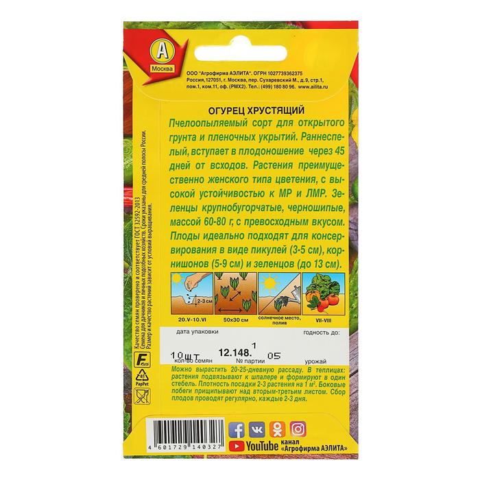 Семена огурцов «Хрустящий» — пчёлоопыляемый сорт для открытого грунта и плёночных укрытий.