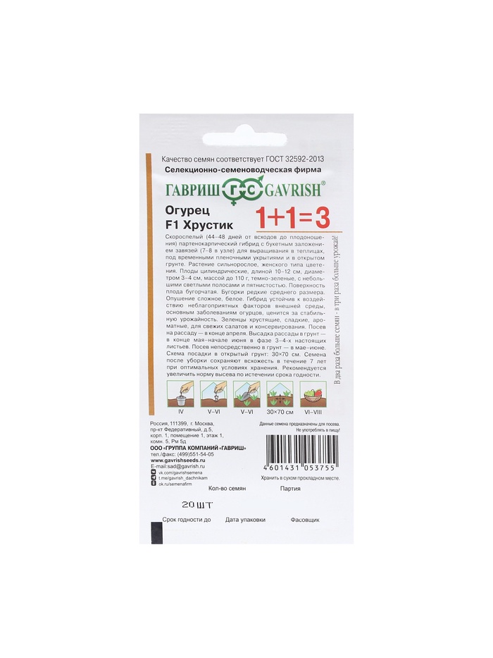 Скороспелый (44-48 дней от всходов до плодоношения) партенокарпический гибрид с букетным заложением завязей (7-8 в узле) для выращивания в теплицах, под временными пленочными укрытиями и в открытом грунте. Растение сильнорослое, женского типа цветения. Плоды цилиндрические, длиной 10-12 см, диаметром 3,5-4,0 см, массой 100-110 г, темно-зеленые, с небольшими светлыми полосами и небольшой пятнистостью. Поверхность плода бугорчатая. Бугорки среднего размера, частота расположения редкая. Опушение сложное, белое. Гибрид устойчив к воздействию неблагоприятных факторов внешней среды, основным заболеваниям огурцов, ценится за стабильную урожайность. Зеленцы хрустящие, сладкие, ароматные, для свежих салатов и консервирования. Урожайность 10,9-11,7 кг/м2.