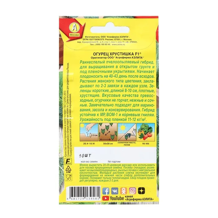Раннеспелый пчелоопыляемый гибрид для открытого грунта и пленочных укрытий, вступает в плодоношение примерно на 45 день от полных всходов. Растения с плетями средней длины, устойчивы к кратковременным похолоданиям, толерантны к настоящей мучнистой росе. Зеленцы короткие цилиндрические, мелкобугорчатые, белошипые, длиной 8-10 см, без горечи, долго не желтеют. Отношение длины плода к диаметру 2,8:1. Вкусные, ароматные, плотные, хрустящие огурчики особенно хороши для маринования и посола.Посев семян в грунт или на рассаду. Возраст рассады при высадке – 20-30 дней. Плотность посадки в открытом грунте 4-5 растений, в теплицах 2-3 растения на 1 кв.м. В теплицах растения подвязывают к шпалере и формируют в один стебель. Боковые побеги прищипывают над 2-3 листом. Растениям необходимы регулярные поливы, прополки, рыхления и подкормки. Сбор плодов нужно проводить регулярно каждые 2-3 дня.