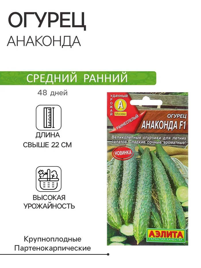 Высокоурожайный партенокарпический гибрид раннего срока плодоношения. Один из лучших для приготовления свежих летних салатов. Сбор плодов начинают на 45- 48 день после всходов. Рекомендуется для выращивания в теплицах и под пленочными укрытиями. Растения преимущественно женского типа цветения. Наличие небольшого количества мужских цветков позволяет растению регулировать нагрузку урожаем и формировать красивые прямые плоды длиной 35-50 см. Огурчики сладкие, с тонкой кожицей, плотной мякотью и великолепным ароматом. Урожайность 11-12 кг/ м 2. Гибрид устойчив к настоящей и ложной мучнистой росе, кладоспориозу, ВОМ.