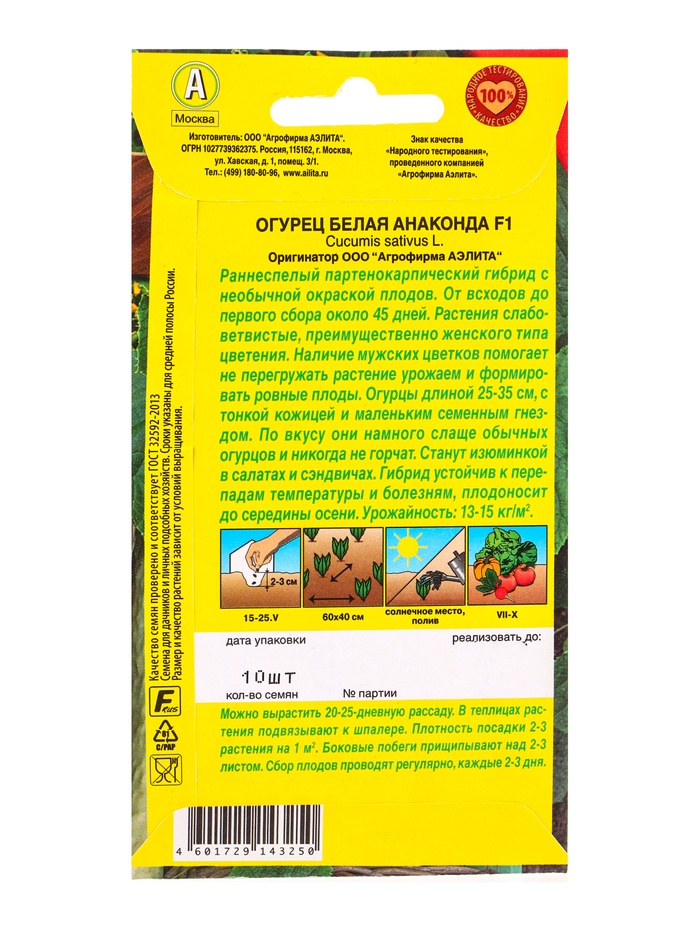 Семена Огурец китайский «Белая анаконда», F1, партенокарпический, 10 шт., «Агрофирма АЭЛИТА» — Характеристики