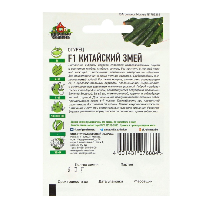 Китайские сорта огурцов славятся непревзойденным вкусом и ароматом плодов: сладкие, сочные, без пустот, с тонкой нежной кожицей и маленькими семенными камерами — идеальны для приготовления свежих летних салатов. Гибрид среднепоздний, пчелоопыляемый. Растение мощное, интенсивно развивающееся, с продолжительным периодом плодоношения. Выращивают с использованием временных пленочных укрытий. Гибрид требователен к плодородию почвы, рекомендуются регулярные подкормки. Зеленец длинный, до 60 см, темно-зеленый, крупно- и редкобугорчатый, с ручкой. Посев на рассаду — в конце апреля. Высадка рассады в грунт — в конце мая–начале июня в фазе 3—4-х настоящих листьев. Посев непосредственно в грунт — в мае–июне. Схема посадки: 50x100 см. Для повышения продуктивности главный побег прищипывают после 6–7 листа. Урожайность при правильной агротехнике достигает 30,0 кг/м2. Семена после уборки сохраняют всхожесть в течение 7 лет при оптимальных условиях хранения. Рекомендуется увеличить норму высева по истечении срока годности.