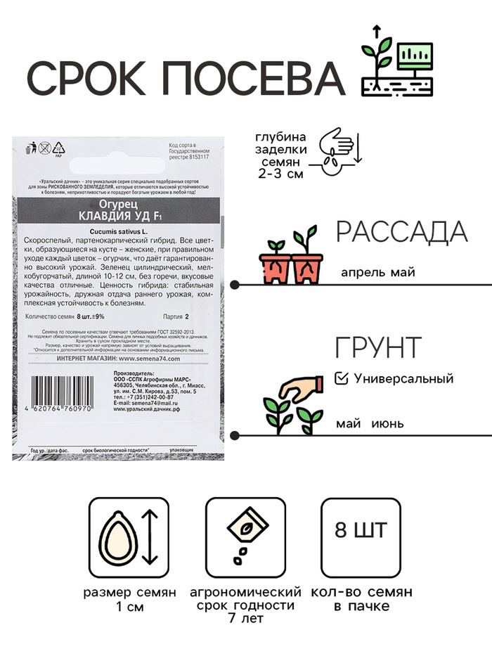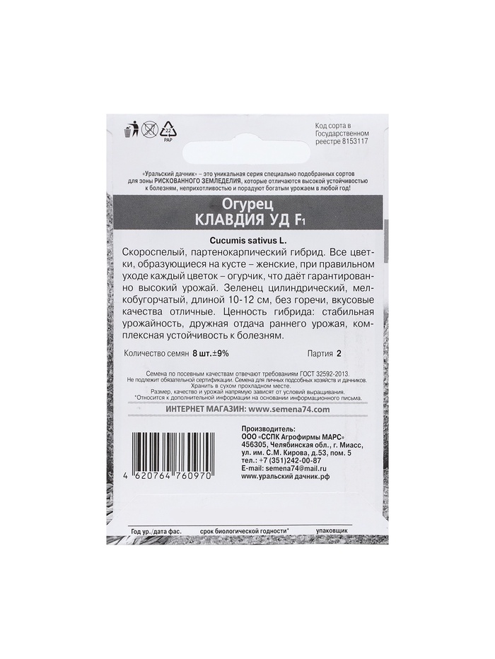 Раннеспелый партенокарпический гибрид для выращивания в открытом грунте под временными пленочными укрытиями. Растение плетистое, с букетным заложением завязей (больше 3-х в узле). Зеленец цилиндрический, мелкобугорчатый, зеленый до темно-зеленого, с короткими полосами, опушение белое. Длина плода 10-12 см, диаметр 3-4 см, масса 64-89 г. Рекомендуется для засолки и маринования, подходит для употребления в свежем виде. Выращивают рассадным способом или прямым посевом в открытый грунт. Гибрид ценится за высокие товарные и вкусовые качества плодов, комплексную устойчивость к болезная огурцов, дружную и стабильную отдачу раннего урожая. Урожайность 2,1-4,8 кг/м2.