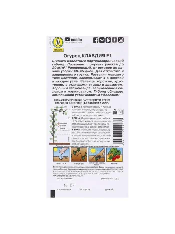 Семена Огурец "Клавдия F1", раннеспелый, партенокарпическии, 10 шт — Характеристики