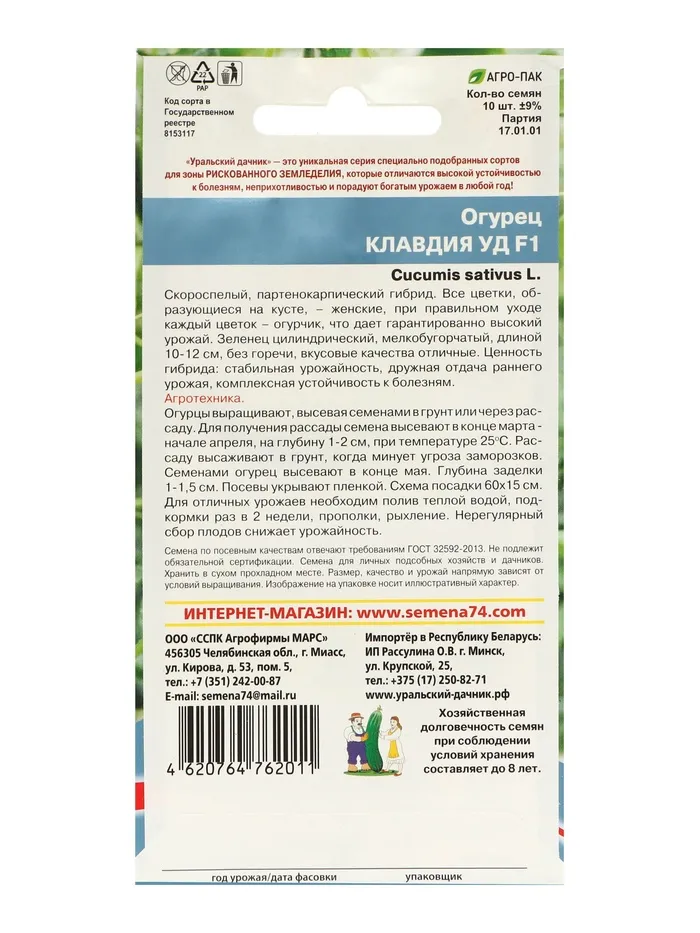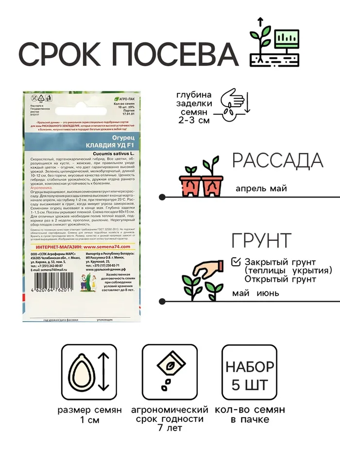 Семена Огурец "Клавдия" F1, раннеспелый, партенокарпический, без горечи, набор 5 шт — Характеристики