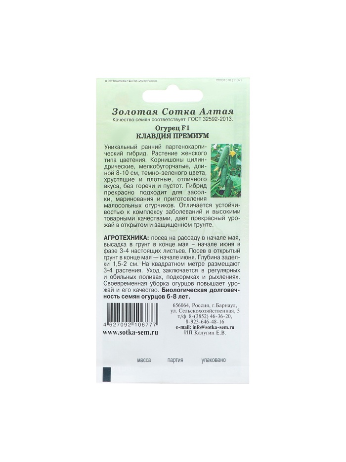 Семена Огурец «Клавдия Премиум», F1, партенокарпический, 0.15 г, «Золотая сотка Алтая» — Характеристики