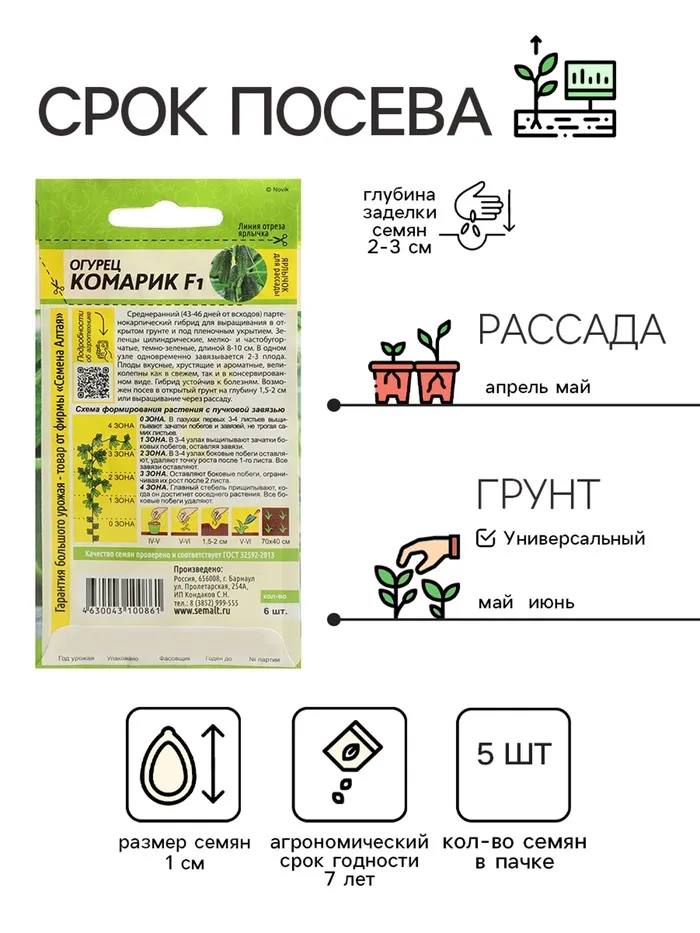 Среднеранний (43-46 дней от всходов) партенокарпический гибрид с букетным заложением завязи для выращивания в открытом грунте и под пленочным укрытием. Зеленцы цилиндрические, мелко- и часто- бугорчатые, темно-зеленые, длиной 8-10 см. В одном узле одновременно завязывается 2-3 плода. Плоды вкусные, хрустящие и ароматные, великолепны как в свежем, так и в консервированном виде. Гибрид устойчив к болезням. Возможен посев в открытый грунт на глубину 1,5-2 см или выращивание через рассаду. Схема формирования растения с пучковой завязью: 0 ЗОНА. В пазухах первых 3-4 листьев выщипывают зачатки побегов и завязей, не трогая самих листьев. 1 ЗОНА. В 3-4 узлах выщипывают зачатки боковых побегов, оставляя завязи. 2 ЗОНА. В 3-4 узлах боковые побеги оставляют, удаляют точку роста после 1-го листа. Все завязи оставляют. 3 ЗОНА. Оставляют боковые побеги, ограничивая их рост после 2 листа. 4 ЗОНА. Главный стебель прищипывают, когда он достигнет соседнего растения. Все боковые побеги удаляют.