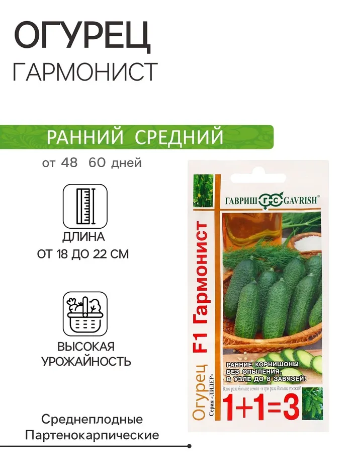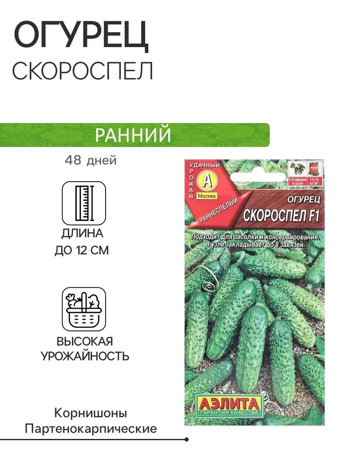 Раннеспелый пчелоопыляемый сорт для выращивания в открытом грунте и под временными пленочными укрытиями. Растение сильноветвистое, длина главной плети достигает 2м. Огурчики имеют правильную овально-цилиндрическую форму, зеленого цвета с продольными светлыми полосами, хрустящие, длина плода 10-14см, диаметр 3,5-5см, масса плода 70-100г. Поверхность огурца крупно-бугорчатая, опушение черное (редкое). Хрустящие плотные плоды не имеют горького вкуса, поэтому идеально подходят как для употребления в свежем виде и приготовления салатов, так и для засолки.
