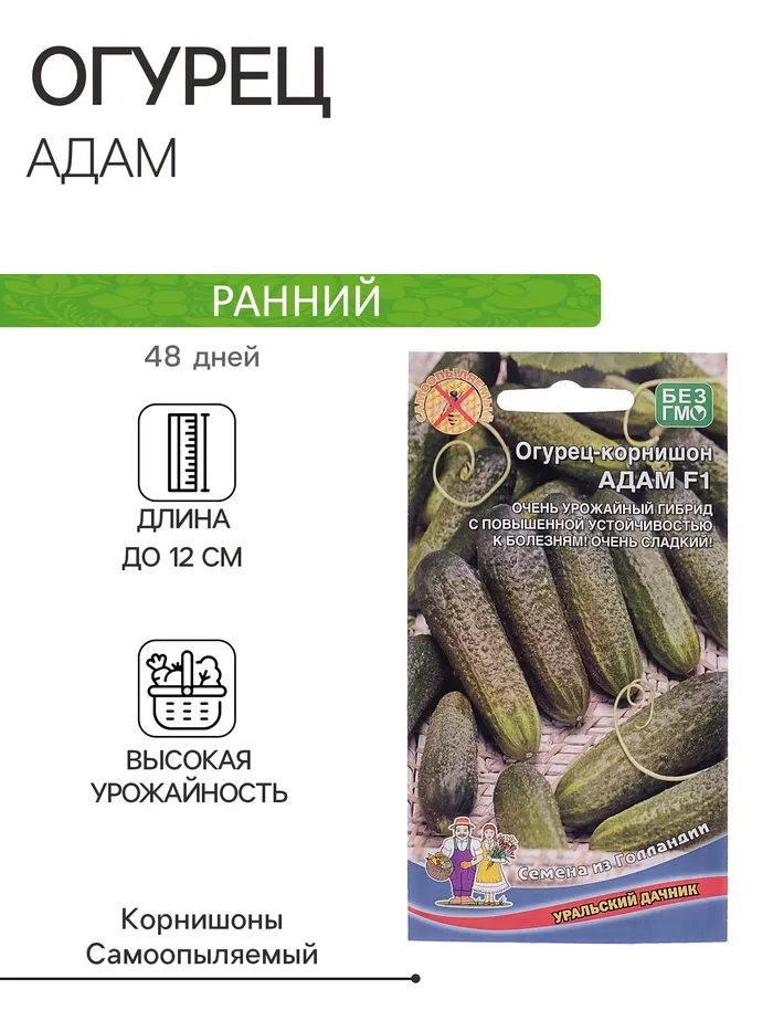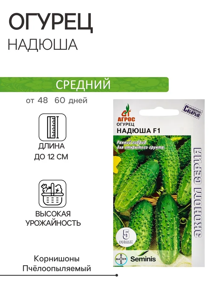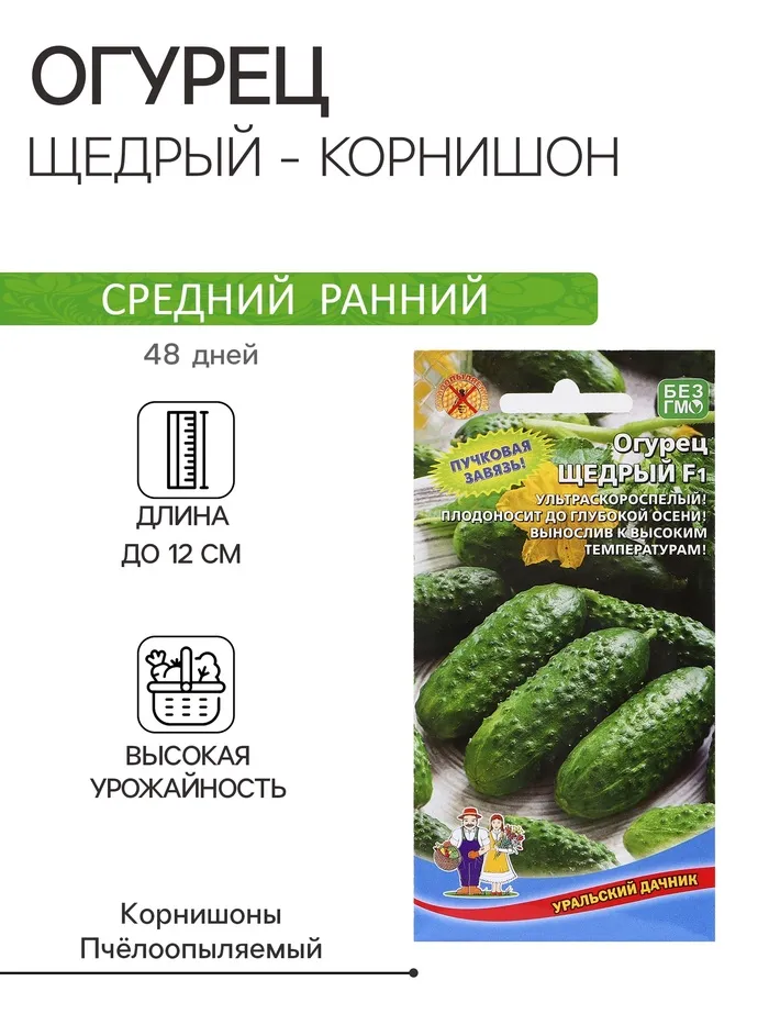 Раннеспелый (47-50 дней) партенокарпический гибрид для выращивания в весенне-летнем обороте под пленочным укрытием. Растение сильнорослое, женского типа цветения, с пучковым заложением завязей. Зеленец цилиндрический, мелкобугорчатый, длиной 7-9 см, массой 60-82 г. Плоды генетически без горечи, прекрасных вкусовых качеств, очень ароматные и хрустящие. Идеален для засолки и консервирования. Гибрид устойчив к вирусу огуречной мозаики, оливковой пятнистости, настоящей мучнистой росе. Неприхотлив в неблагоприятных погодных условиях. Схема формирования растения с пучковой завязью: 0 ЗОНА. В пазухах первых 3-4 листьев выщипывают зачатки побегов и завязей, не трогая самих листьев. 1 ЗОНА. В 3-4 узлах выщипывают зачатки боковых побегов, оставляя завязи. 2 ЗОНА. В 3-4 узлах боковые побеги оставляют, удаляют точку роста после 1-го листа. Все завязи оставляют. 3 ЗОНА. Оставляют боковые побеги, ограничивая их рост после 2 листа. 4 ЗОНА. Главный стебель прищипывают, когда он достигнет соседнего растения. Все боковые побеги удаляют.