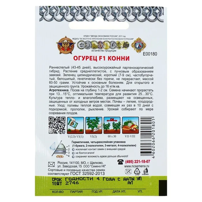 Посев рассады в конце апреля. Высадка в грунт в конце мая — начале июня в фазе 3–4 настоящих листьев. Посев непосредственно в грунт в мае — июне. Схема посадки: 30 × 70 см. Гибрид устойчив к мучнистой росе и корневым гнилям. Ценится за высокое качество вкусных, ароматных плодов. Благодаря короткоплодности, очень удобен для засолки и маринования. Товарная урожайность: 12,6–16 кг/м².