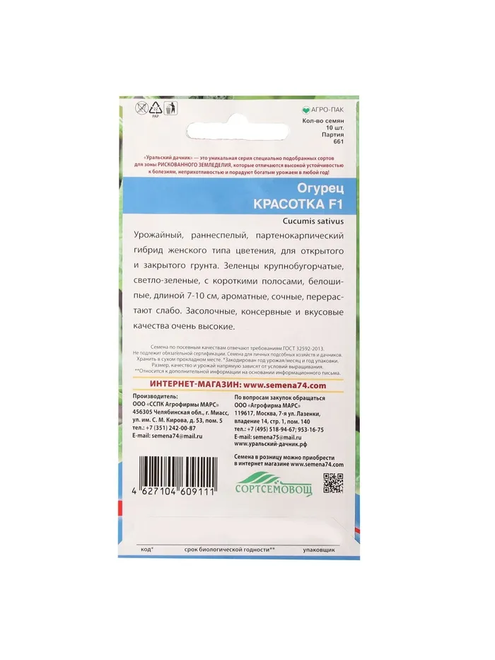 Семена Огурец "Красотка", F1, 10 шт — Характеристики