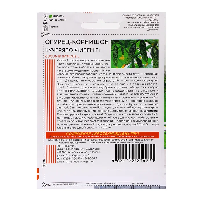 Корнишоны появляются уже через 42-44 дня после всходов, причём при правильной агротехнике в букетах будет по несколько завязей. Они появятся в любом случае, так как гибрид партенокарпического типа, образующий женские цветы без опыления насекомыми. Поэтому урожай гарантирован! Огурчики – хоть в засолку, хоть в салат, хоть в нарезку: небольшие – 9-11 см в длину, крупнобугорчатые, слегка ребристые, без пустот и горечи – совершенно универсальны в использовании.