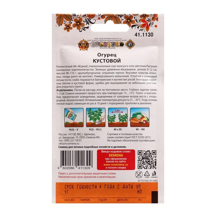 Скороспелый, пчелоопыляемый сорт, с дружным формированием плодов, женского типа цветения. Предназначен для выращивания в открытом грунте и под временными пленочными укрытиями. Растение компактное, слабоветвящееся. Зеленец удлиненно- яйцевидной формы, темно-зеленый, длина плода 9-12 см, масса - 80-90 г, не желтеет в течение 3-5 дней. Урожайность 10-12 кг/м2. Засолочный. Вкусовые качества хорошие. Посев на рассаду в начале мая. Высадка в грунт в конце мая - начале июня в фазе двух-трех настоящих листьев. Посев в открытый грунт проводится в конце мая - начале июня. Схема посадки 30х30 см.