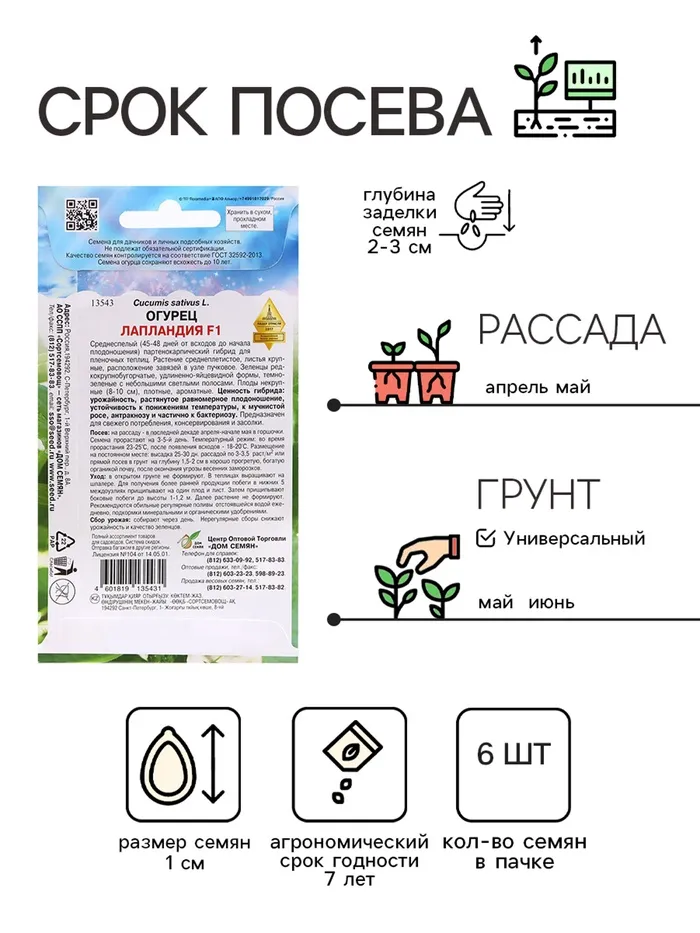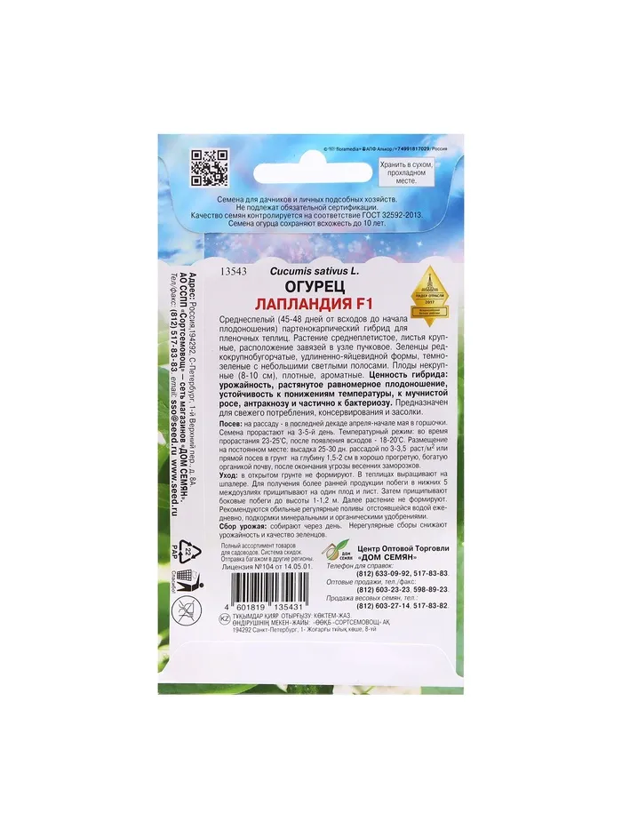Среднеспелый - вступает в плодоношение на 45-48 день после массовых всходов, партенокарпический (не требует опыления) гибрид. Растение среднеплетистое, с интенсивным ростом, листья крупные. Расположение завязей в узлах пучковое. Зеленец длиной 8-9 см, красивой вытянутояйцевидной формы, темно-зеленого цвета с белыми полосами, доходящими до 1/3 плода, крупнобугорчатый, бугорки расположены редко. Гибрид устойчив к мучнистой росе, антракнозу и относительно устойчив к бактериозу. Для регионов с прохладным климатом необходим рассадный способ выращивания. Семена высевают в горшочки диаметром 10 см со специально подготовленной почвой (2 части перегноя, 1 часть дерновой земли, 1 част песка) на глубину 1,5 см. Температура воздуха и почвы должна быть 20-23°С. Грунт равномерно увлажняют (не допускается перелив и закисание почвы). После появления всходов, в процессе роста растений, не допускать снижение температуры ниже 14°С. Сделать 1-2 подкормки полным минеральным удобрением с преобладанием азота. Рассада высаживается, когда минует угроза заморозков.