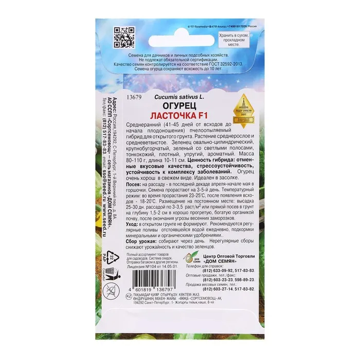 Ранний и урожайный пчелоопыляемый гибрид для открытого грунта с созреванием первых плодов через 41-45 дней после всходов. Урожая хватит и "на покушать", и "на засолить". Зеленцы овальные со светлыми размытыми полосками, бугорчатость средняя, опушение черное. Средние размеры: длина - 11,4-12 см, диаметр - 3,6 см. Масса 83-113 г. Вкусовые качества - отменные, будь то свежие, соленые или маринованные огурцы. Ровные плоды годятся для засолки и консервирования в малогабаритной таре. Растение индетерминантного типа, среднерослое и средневетвистое, преимущественно женского тип цветения. Гибрид отличается комплексной устойчивостью к огуречным заболеваниям.