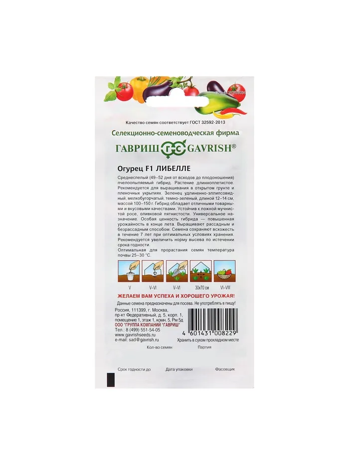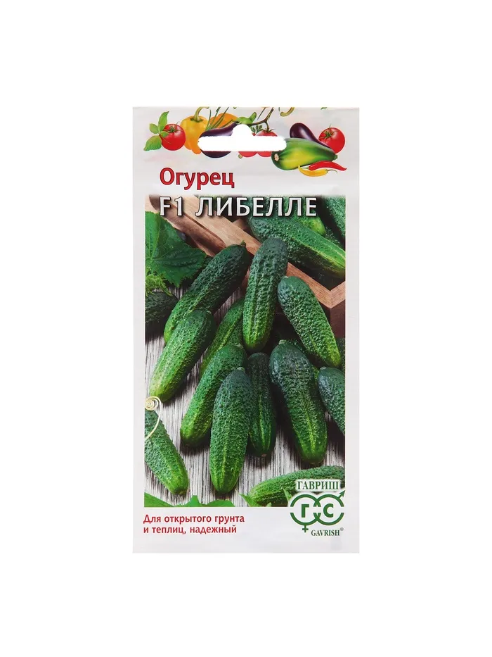 Семена Огурец Либелле F1. Высокоурожайный среднеспелый пчелоопыляемый гибрид, период от всходов до плодоношения 49-52 дня. Рекомендуется для открытого грунта и пленочных укрытий. Урожайность 8-10 кг/м2. Растения преимущественно женского типа цветения. Плоды веретеновидные, мелкобугорчатые, длиной 10-13 см, массой 100-140 г, плотные, хрустящие. Вкус отличный, без горечи. Отлично подходят для потребления в свежем виде, соления и маринования. Особая ценность гибрида - повышенная урожайность в конце лета и устойчивость к основным болезням культуры. Агротехника. Посев семян в грунт или на рассаду. Возраст рассады при высадке – 20-30 дней. Плотность посадки в открытом грунте 4-5 растений, в теплицах 2-3 растения на 1 кв.м. В теплицах растения подвязывают к шпалере и формируют в один стебель. Боковые побеги прищипывают над 2-3 листом. Сбор плодов нужно про-водить регулярно каждые 2-3 дня.