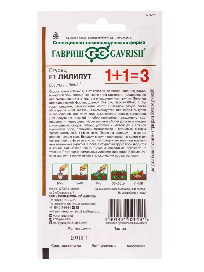 Скороспелый (38-42 дня от всходов до плодоношения) партенокарпический гибрид женского типа цветения, предназначен для выращивания в открытом и защищенном грунте. Зеленец цилиндрической формы длиной 7-9 см, массой 80-90 г, бугорки средние, расположены часто. В каждой пазухе листа образуется 7-10 завязей. Посев на рассаду в конце апреля – начале мая. Высадку в грунт производят в конце мая – начале июня в фазе двух-трех настоящих листьев под временные пленочные укрытия. Посев в открытый грунт производится в конце мая – в начале июня. Рекомендуется для сбора пикулей и корнишонов, для получения высококачественных консервов. Для получения пикулей – сбор производят ежедневно, корнишонов – через день. Нерегулярные сборы урожая приводит к утолщению плодов. Гибрид устойчив к настоящей и ложной мучнистым росам, оливковой пятнистости и корневым гнилям. Урожайность 10,5-11,5 кг/м2 Оптимальная для прорастания семян температура почвы 25-30°C.