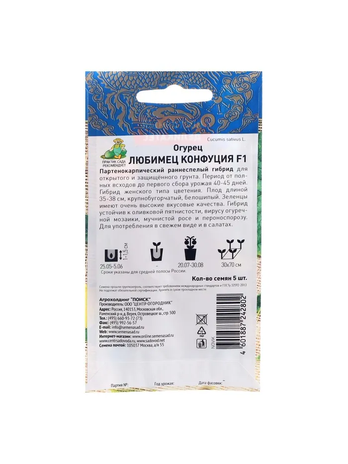 Семена Огурец "Любимец Конфуция", F1, 5 шт — Характеристики