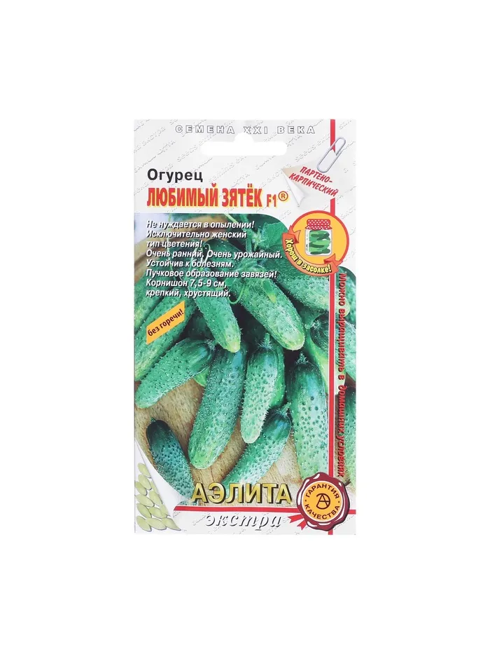 «Любимый зятёк» — цилиндрический крупнобугорчатый гибрид длиной 7,5–9 см и массой 80–95 г. Отлично подходит для употребления в свежем виде, консервирования и засолки. Урожайность в открытом грунте — до 15 кг/м², в закрытом — до 30 кг/м². Обладает высокой устойчивостью к настоящей и ложной мучнистой росе, вирусу огуречной мозаики и оливковой пятнистости.