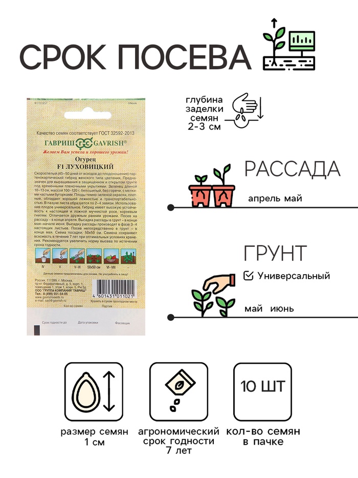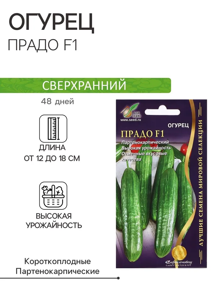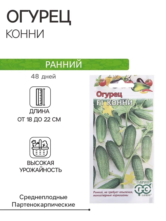 Скороспелый (45–50 дней от всходов до плодоношения) партенокарпический гибрид женского типа цветения. Предназначен для выращивания в защищенном и в открытом грунте под временными пленочными укрытиями. Зеленец длиной 10–13 см, массой 100–120 г, с часто расположенными, мелкими бугорками, без горечи. Плоды темно-зеленой окраски, плотные, обладают хорошей лежкостью и транспортабельностью. В пазухе листа образуется по 1–2 завязи. Использование плодов универсальное. Гибрид имеет высокую устойчивость к настоящей и ложной мучнистой росе, корневым гнилям. Отличается дружным ранним урожаем. Урожайность одного растения 6,0–8,0 кг. Посев на рассаду в конце апреля. Высадка рассады в грунт в конце мая–начале июня. Высадка рассады производится в фазе 3–4-х настоящих листьев. Посев непосредственно в грунт – в конце мая. Схема посадки: 50х50 см.
