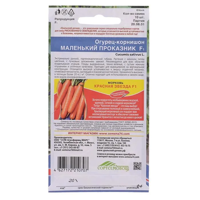 Экстремально ранний, партенокарпический гибрид. Растения с женским типом цветения, с пучковым заложением завязей. Рекомендуется для всех областей возделывания огурцов. Плоды выровненные, тёмно-зелёные, с густым нежным опушением и отличным качеством. Пригоден для выращивания на вертикальной конструкции. Отличается высокой устойчивостью к вирусу огуречной мозайки, оливковой пятнистости, настоящей и ложной мучнистой росе. Урожайность высокая – в теплицах более 20 кг/м2. Отлично подходит для использования в свежем виде, всех видов консервирования.
