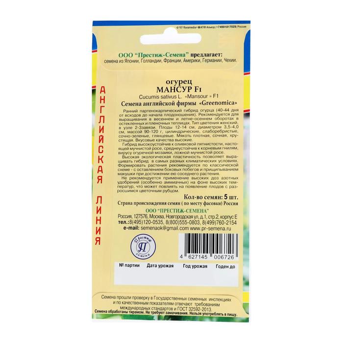Ранний партенокарпический гибрид огурца (40-44 дня от всходов до начала плодоношения). Рекомендуется для выращивания в весеннем и летне-осеннем оборотах в остекленных и пленочных теплицах. Тип цветения женский, в узле 2-3завязи. Плоды 12-14 см, диаметром 3,5-4,0 см, массой 90-120 г, цилиндрические, слаборебристые, сочно-зеленые, глянцевые. Мякоть плотная, сочная, хрустящая. Вкусовые качества высокие. Гибрид высокоустойчив к оливковой пятнистости, настоящей мучнистой росе, среднеустойчив к корневым гнилям, вирусу огуречной мозаики, ложной мучнистой росе. Высокая экологическая пластичность позволяет выращивать гибрид в самых разных климатических условиях. Формировать растения рекомендуется по классической схеме - с оставлением боковых побегов и прищипыванием макушки при достижении ею соседнего растения. Не рекомендуется применение высоких доз азотных удобрений (особенно аммиачных) на фоне высоких температур, что может повлиять на появление плодов с разросшимся цветочным рубцом.